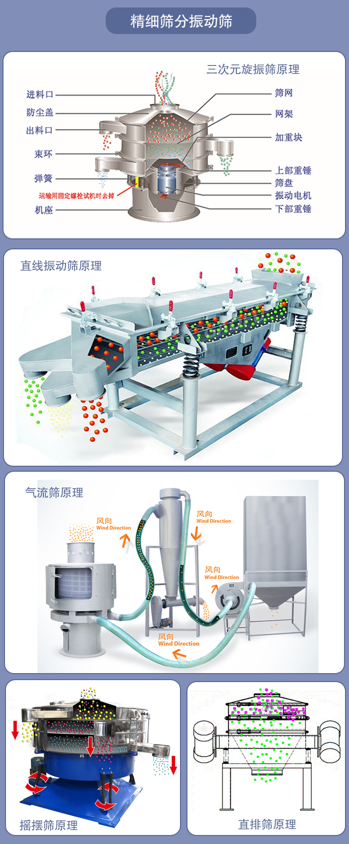 振動(dòng)篩又被叫做篩粉機(jī)、電動(dòng)篩,是一種適合與精細(xì)物料篩分的振動(dòng)篩分機(jī)械設(shè)備,被各行各業(yè)所廣泛使用,尤其體現(xiàn)在食品行業(yè)和化工行業(yè)的生產(chǎn)活動(dòng)中。振動(dòng)篩設(shè)備分類廣泛,精細(xì)篩分設(shè)備是用處最廣的,那么小編今天就和大家分享精細(xì)篩分中各種篩分設(shè)備的原理。