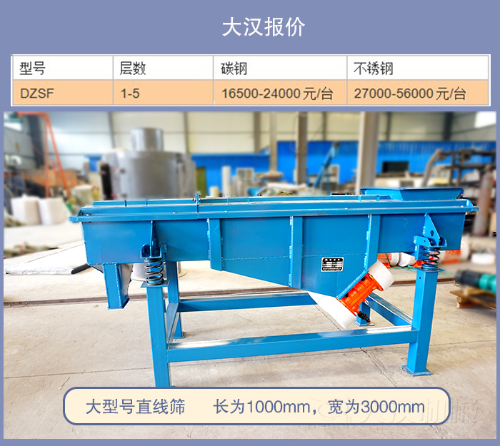 直線篩長為1000mm,寬為3000mm,屬于一種大型號直線篩,那么一臺直線篩價格多少呢?新鄉(xiāng)大漢在線為您報價。