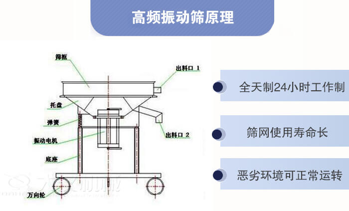 高頻振動篩又稱高頻過濾篩,結(jié)構(gòu)簡單、體積小、具有高頻率,低耗能的特點,頻率每分鐘可達(dá)3000次,比相同機型的篩分過濾設(shè)備耗能減少一半,與物料接觸部分皆可采用不銹鋼304或者316L材質(zhì)。